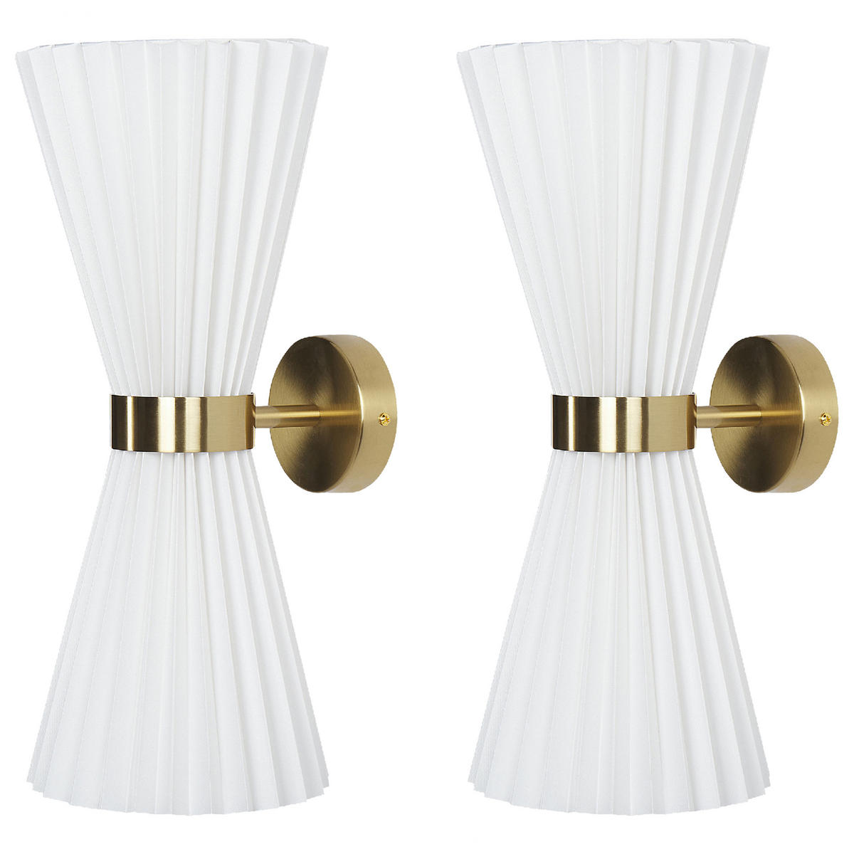 Moderne, 2-flammige Wandstrahler mit weißen Stoffschirmen. Lassen Sie Ihr Wohn- oder Schlafzimmer im neuen Licht erstrahlen und peppen Sie sie mit diesem Wandlampen-Set auf. Die weißen Schirme der Leuchten bestehen aus natürlichen Baumwollfasern und bestechen mit ihrer einzigartigen Rillen-Optik, die den Wandlampen einen stilvollen Look zusichert. Ergänzt wird das Modell mit glänzenden Metalldetails, die mit ihrem sanften Schimmer Eleganz an Ihr Bett oder neben Ihr Sofa bringen. Dabei zeichnen sich die ausgewählten Materialien durch Ihre Hochwertigkeit und Pflegeleichtigkeit aus, so können Sie sich sicher sein, dass Ihnen die besondere Schönheit dieser Leuchten auch ohne besondere Pflege viele Jahre lang erhalten bleibt.
