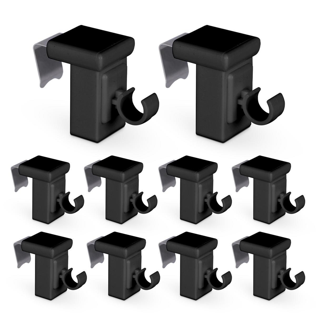 Gefertigt aus robustem Kunststoff überzeugen die Klemmträger durch ihre Langlebigkeit und zuverlässige Funktion. Bei Bedarf lassen sie sich rückstandslos entfernen und erneut verwenden. Das schwarze Design fügt sich harmonisch in moderne Einrichtungen und dunkle Fensterrahmen ein und sorgt für eine dezente, funktionale Optik.