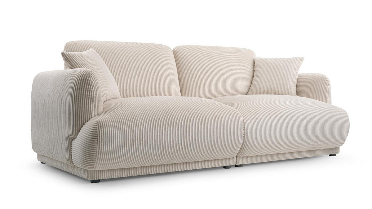 Es wird mit zwei Rückenkissen und zwei Zierkissen geliefert, die seinen gemütlichen Charakter unterstreichen und dem Ganzen ein harmonisches Aussehen verleihen. Der Bezug aus angenehmem Cordstoff verleiht dem Sofa eine einzigartige Textur und einen dezenten, trendigen Look. Die markanten Nähte und die robuste Konstruktion garantieren Langlebigkeit und Komfort.