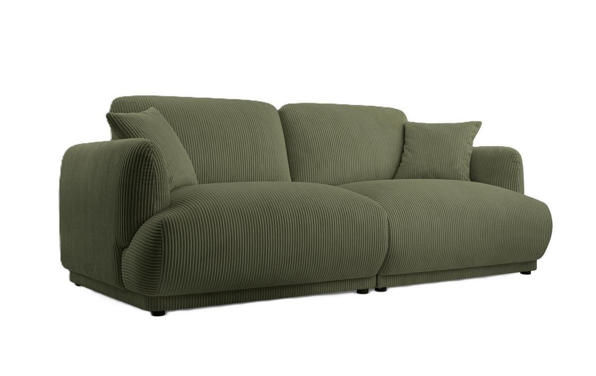 Es wird mit zwei Rückenkissen und zwei Zierkissen geliefert, die seinen gemütlichen Charakter unterstreichen und dem Ganzen ein harmonisches Aussehen verleihen. Der Bezug aus angenehmem Cordstoff verleiht dem Sofa eine einzigartige Textur und einen dezenten, trendigen Look. Die markanten Nähte und die robuste Konstruktion garantieren Langlebigkeit und Komfort.