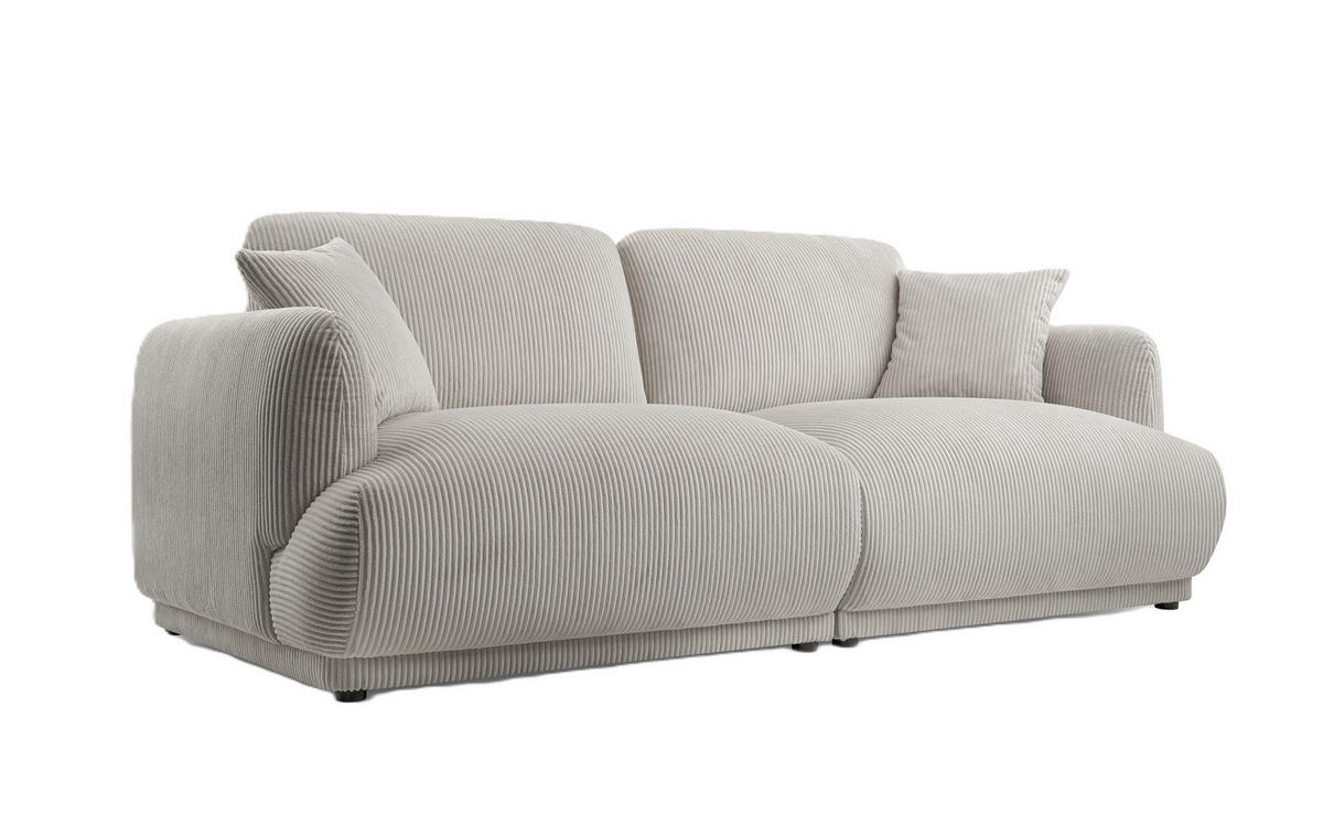 Es wird mit zwei Rückenkissen und zwei Zierkissen geliefert, die seinen gemütlichen Charakter unterstreichen und dem Ganzen ein harmonisches Aussehen verleihen. Der Bezug aus angenehmem Cordstoff verleiht dem Sofa eine einzigartige Textur und einen dezenten, trendigen Look. Die markanten Nähte und die robuste Konstruktion garantieren Langlebigkeit und Komfort.