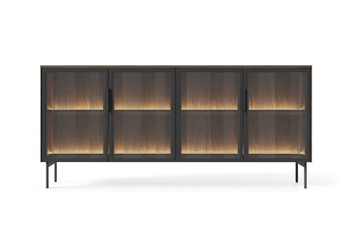 Die breite Kommode ILUMI ist ein minimalistisches und dennoch geräumiges Möbelstück, das sich perfekt in moderne Innenräume einfügt. Hinter vier Türen verbergen sich geräumige Einlegeböden, die reichlich Stauraum bieten. Dank des gehärteten braunen Antisol-Glases und der integrierten LED-Beleuchtung erhält das Innere der Kommode einen einzigartigen Charakter.