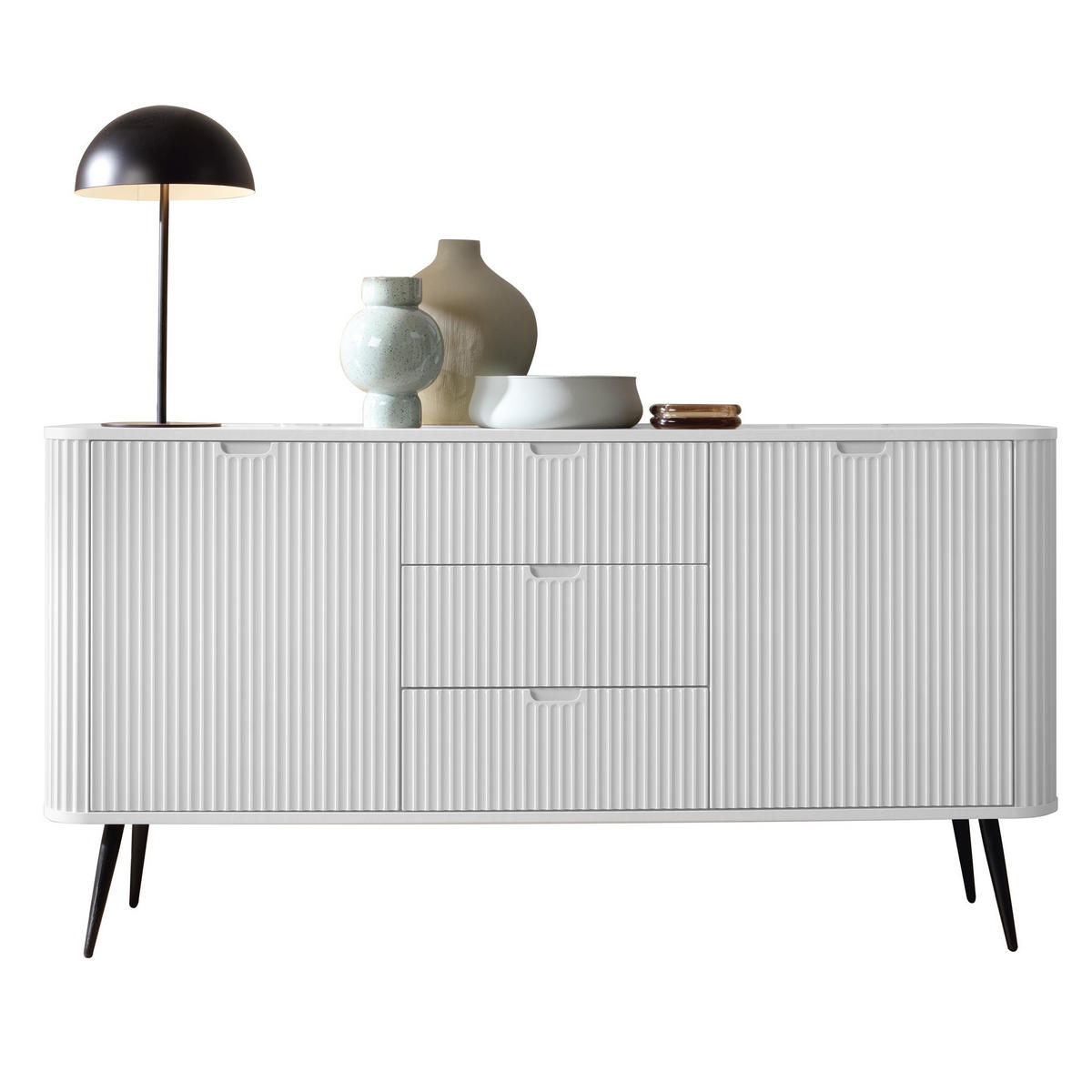 Griffe in Form von gefrästen, stilvollen Vertiefungen verleihen dem Möbel einen einzigartigen, modernen Charakter. Die Kommode verfügt über