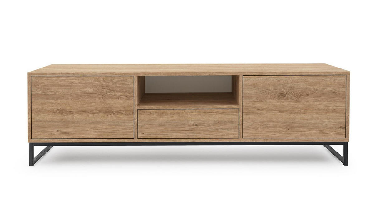 Der RTV-Schrank GENUA ist die perfekte Lösung für moderne und stilvolle Innenräume. Die Farbgebung in Eiche verleiht ihm Eleganz und Wärme, während der schwarze hohe Rahmen einen modernen Touch verleiht. Das Möbel ist mit zwei geräumigen Schränken mit Türen ausgestattet, in denen Sie Ihr Zubehör unterbringen können, sowie mit einer Schublade für zusätzliche Gegenstände. Das offene Regal ermöglicht die bequeme Aufbewahrung Ihrer RTV-Ausrüstung und bietet einen einfachen Zugriff auf Ihre Geräte. Der aus laminierter Möbelplatte gefertigte Schrank ist langlebig und pflegeleicht, während die kunststoffgeschützten Kanten vor Beschädigungen schützen. Hochwertige Scharniere garantieren eine komfortable Nutzung. Entscheiden Sie sich für den Schrank GENUA und verleihen Sie Ihrem Wohnzimmer einen modernen Touch.