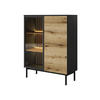 Im Inneren präsentiert sich die Vitrine in einer Kombination aus schwarzer Farbe und Eichenholzdekor, was ihr einen einzigartigen Charakter verleiht. Das dreitürige Design mit 5 geräumigen Einlegeböden ermöglicht es Ihnen, eine Vielzahl von Gegenständen zu verstauen und gleichzeitig für Ordnung zu sorgen. Die hohen Holzbeine verleihen der Vitrine Leichtigkeit und Eleganz und machen sie zur perfekten Wahl für moderne Innenräume.
