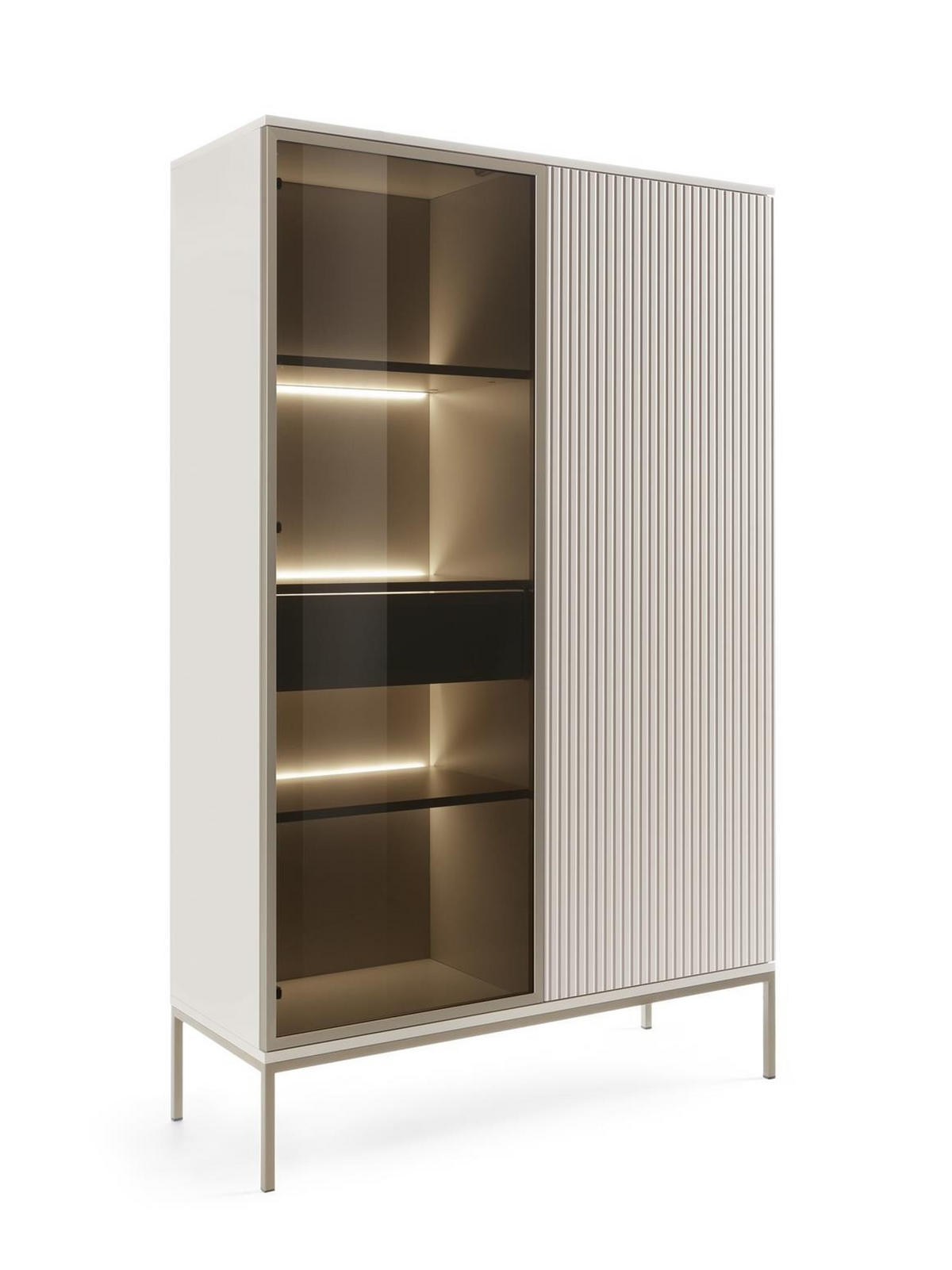 Die Vitrine SENTINO in Kaschmir ist ein elegantes Möbelstück, das Modernität und Funktionalität in das Wohnzimmer bringt. Die geriffelten Fronten in einem Kaschmir-Farbton bestechen durch einen dezenten, aber raffinierten Look.
