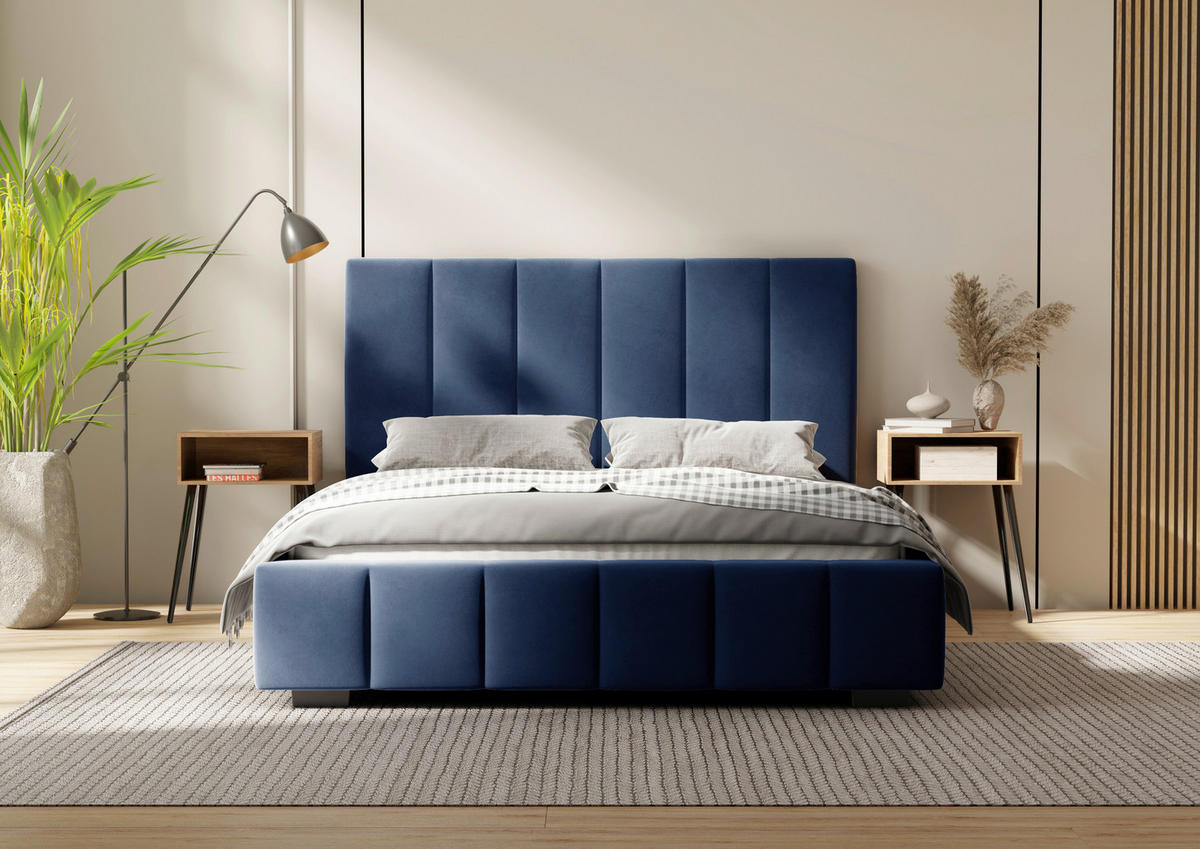 Polsterbett 140 x 200 mit Velours-Bezug in Blau mit Lattenrost und Bettkasten