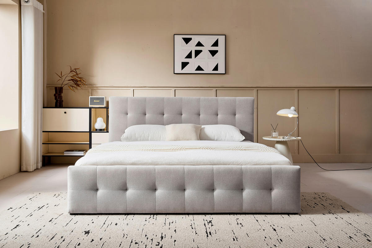 Bettkasten können dank zusätzlichem Stauraum Wohnaccessoires und Co. griffbereit untergebracht werden. Einschlafen, entspannen, genießen – mit diesem Polsterbett (ca. 140 x 200 cm) in Hellgrau inklusive Bettkasten, Lattenrost und gepolstertem Kopfteil, das zur Oase der Ruhe wird!