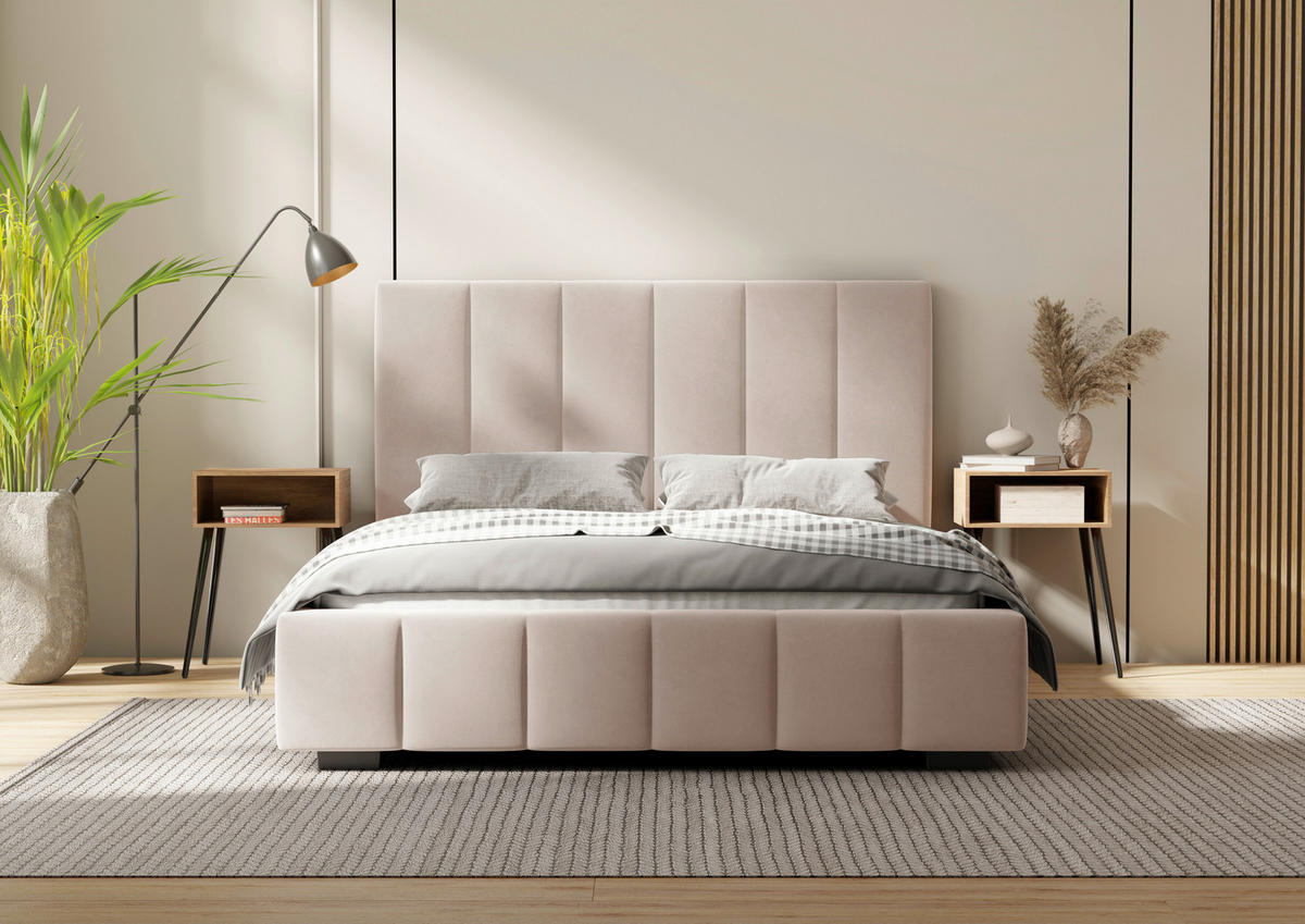 Polsterbett 160 x 200 mit Velours-Bezug in Beige mit Lattenrost und Bettkasten