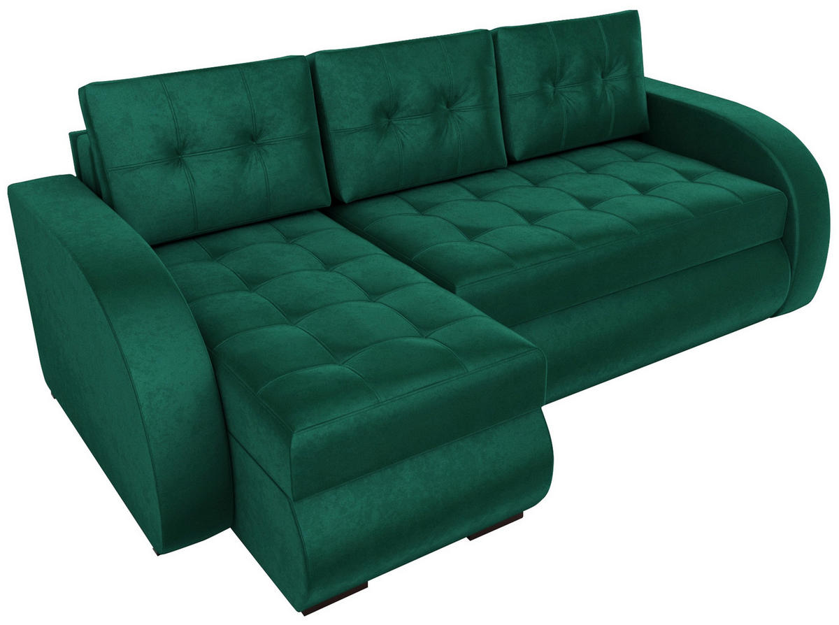 Das Ecksofa BERGEN vereint Eleganz und modernen Stil und wird zum Highlight in jedem Wohnzimmer. Der gesteppte Sitz und die drei Rückenkissen bieten Komfort und ästhetischen Charme. Mit Schlaffunktion (138x200 cm) ist es ideal für Entspannung und Gästeübernachtungen.Abgerundete SeitenDie abgerundeten Seiten verleihen dem Sofa eine filigrane, gemütliche Note und verbessern den Komfort als Rückenlehne.BettwäschebehälterEin praktischer Bettkasten unter der Sitzfläche ermöglicht ordentliches Verstauen von Decken und Kissen.VelourspolsterungDer luxuriöse Veloursstoff bringt Eleganz und Weichheit, ist langlebig und verleiht dem Raum eine besondere Atmosphäre.Bonnell-Federn Ermöglichen ein häufigeres Schlafen auf einem Ecksofa und vermeiden mit der Zeit bedingte Verformungen. Sie zeichnen sich durch ihre Sanduhrform aus, dank der ihre Härte mit zunehmendem Druck zunimmt.Stabilität bietet. Detaillierte Abmessungen des Sofas: