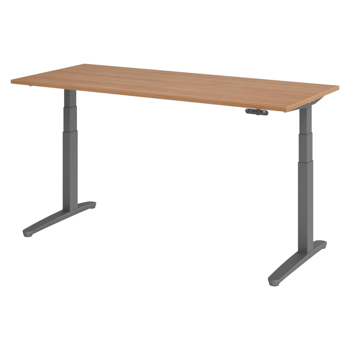 Der elektrische Designer-Schreibtisch XBHM von bümö ist ein ergonomisch, stufenlos höheneinstellbarer Profischreibtisch ohne störende Quertraverse für Ihren Arbeitsplatz. Seine Arbeitshöhe von 65-130 cm wird über einen Elektroantrieb eingestellt und ist somit perfekt für kleine als auch große Menschen geeignet. Ein Schalter mit Display & Memoryfunktion dient zum Einstellen der gewünschten Arbeitshöhe per Höher- und Tiefertaste. Der Bürotisch eignet sich durch seine max. Höhe von 130 cm perfekt auch als Steharbeitsplatz. Eine Höhenjustierung an den Tischkufen garantiert auch auf unebenen Böden kippelfreien, stabilen Stand. Der Büroschreibtisch kommt aufgrund seiner vielfältigen Konfiguration überall perfekt zum Einsatz!