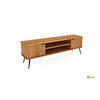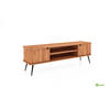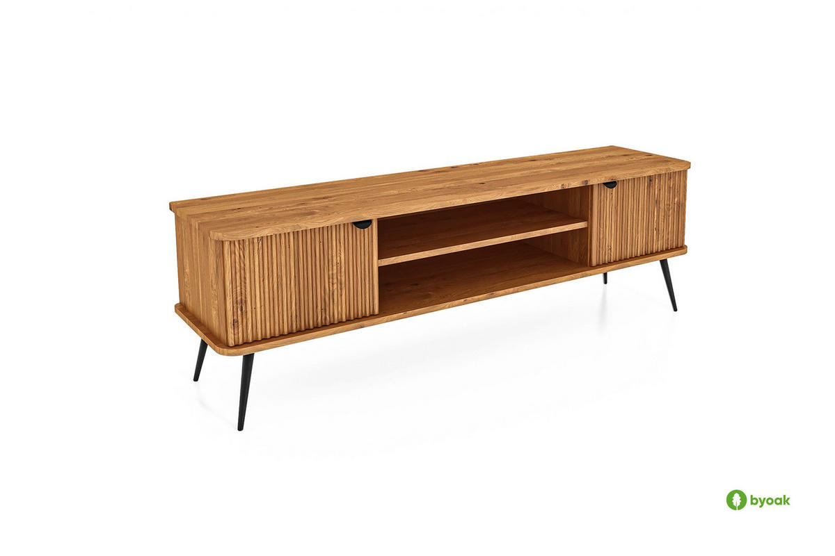 Wie ein klassischer TV-Schrank, aber sein Schema von Regalen und Schränken ist nicht Standard und banal. Zunächst einmal hat das Möbelstück keine Symmetrie, so ist es interessant, auf den ersten Blick. Niemand kann ihm jedoch mangelnde Funktionalität vorwerfen, denn alles, was in einem solchen Möbelstück verborgen sein sollte, wird es auch sein. Das Schema wird hier mit zeitlosen Klassikern und perfekter Verarbeitung kombiniert. Die schöne Maserung des Eichenholzes wurde mit zusätzlichen Elementen, wie z.B. schwarzen Griffen und Beinen verwöhnt.