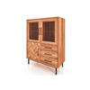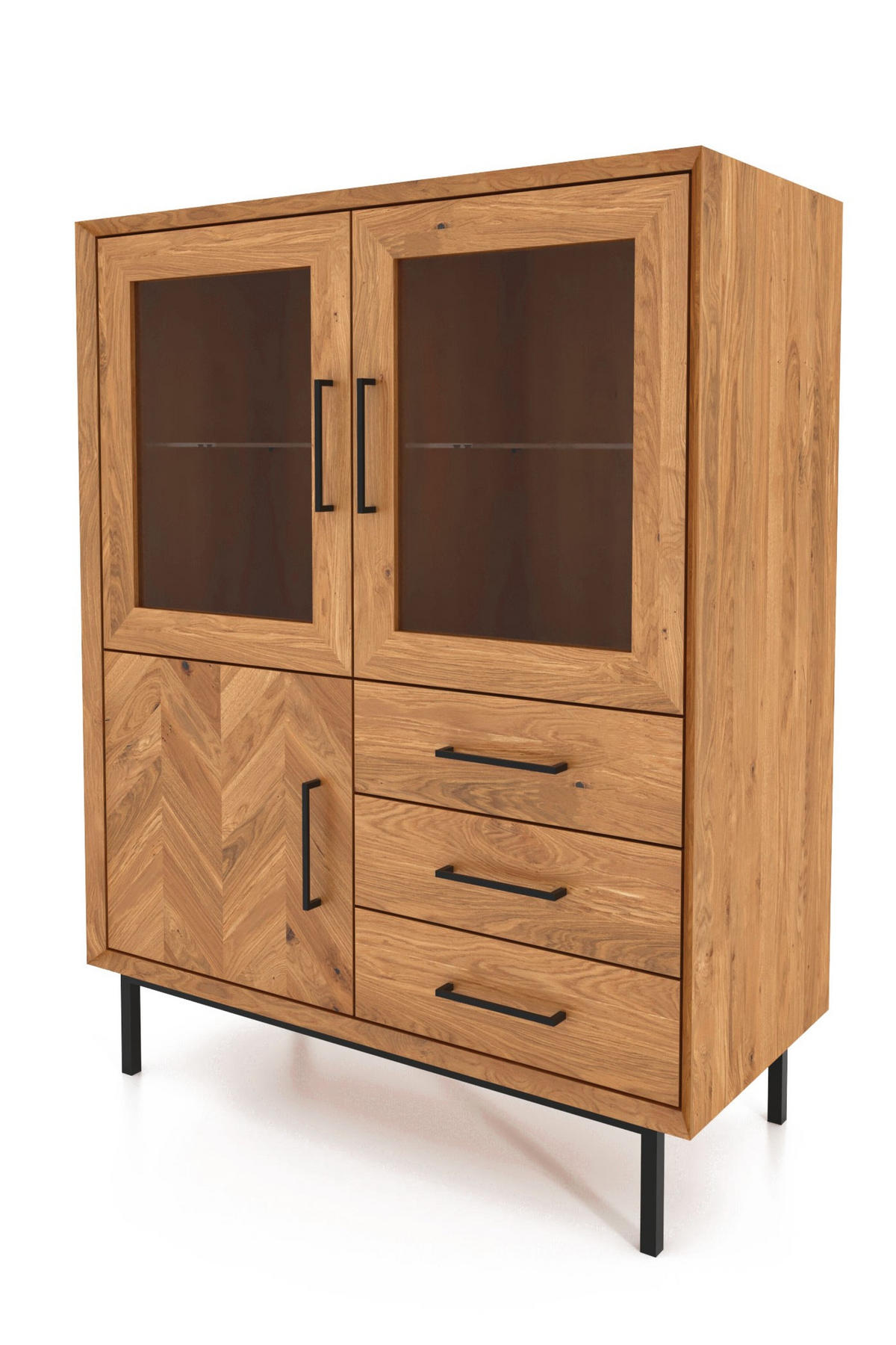 Riesige Vitrinen, gefüllt mit Mehrgenerationengeschirr und einer Sammlung von Kristallen, sind obsolet. Jetzt herrschen ordentliche, kompakte Vitrinen vor, in denen es neben einem Ausstellungsort auch einen Platz zum Verstecken gibt. Das Modell stammt aus einer Kollektion, deren Merkmal ein Fischgrätmuster auf der Vorderseite ist. Diesmal haben wir es an der Schranktür platziert.