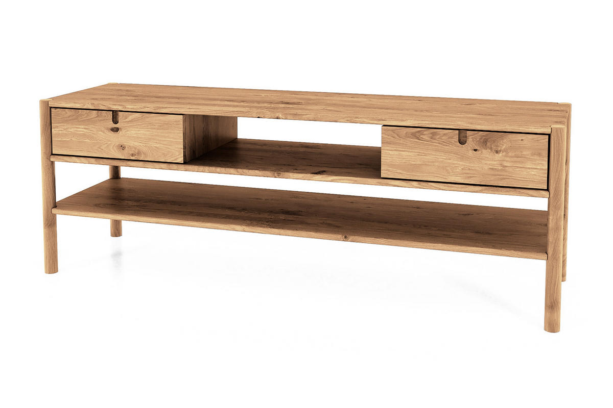 Hier ist ein Standard-Fernsehtisch, der "das gewisse Etwas" hat. Und "das gewisse Etwas" ist sicherlich ein langes, zusätzliches Regal. Wir haben also zwei Schubladen mit gefrästen, stilvollen Griffen, in der Mitte ein offenes Regal, und darunter erstreckt sich über die gesamte Länge des Möbels ein zusätzliches, erwähntes Regal. Ein Komplex aus verschiedenen Ablagemöglichkeiten ist eine sehr praktische Lösung. Und das Wohnzimmer ist ein Ort, an dem es viele Geräte geben wird, für die es immer nicht genug Platz gibt.