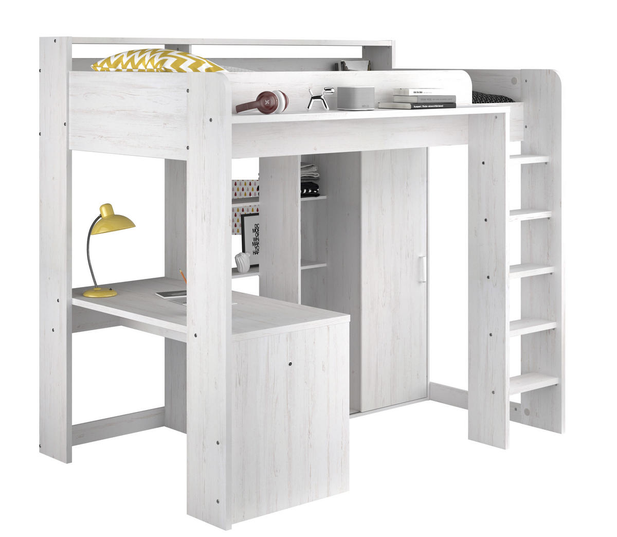 Dieses Hochbett ist perfekt für kleinere Räume und sorgt für optimale Raumnutzung. Dank der cleveren Kombination aus Bett, Schreibtisch und Kleiderschrank bleibt mehr Platz für Freizeit und Kreativität.