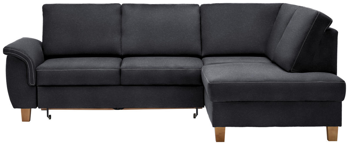 Als treue Begleitung für wonnige Time-outs daheim gesellt sich dieses anthrazitgraue Ecksofa mit Flachgewebe-Bezug gerne zu Ihnen!
