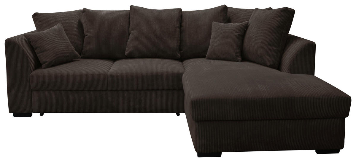 Wenn dieses dunkelbraune Ecksofa mit Cord-Bezug bei Ihnen einzieht, übernimmt Behaglichkeit das Kommando!