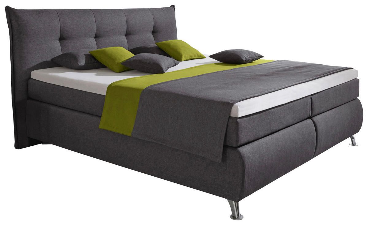 Das Bett strahlt mit seiner schlichten Optik pure Eleganz aus. Die Webstoff-Oberfläche in Anthrazit wird durch die runden Füße in Chromfarben edel ergänzt. Das gepolsterte Kopfteil mit Steppung lädt zum Zurücklehnen und Entspannen ein. Es unterstützt Ihren Körper ideal, wenn Sie abends gerne noch ein paar Seiten Ihres Lieblingsromans lesen. Preis versteht sich ohne Topper, Bettwaren und Dekoration. Auf diesem Boxspringbett 180 x 200 cm in Grau genießen Sie komfortable Stunden bei Tag und Nacht!