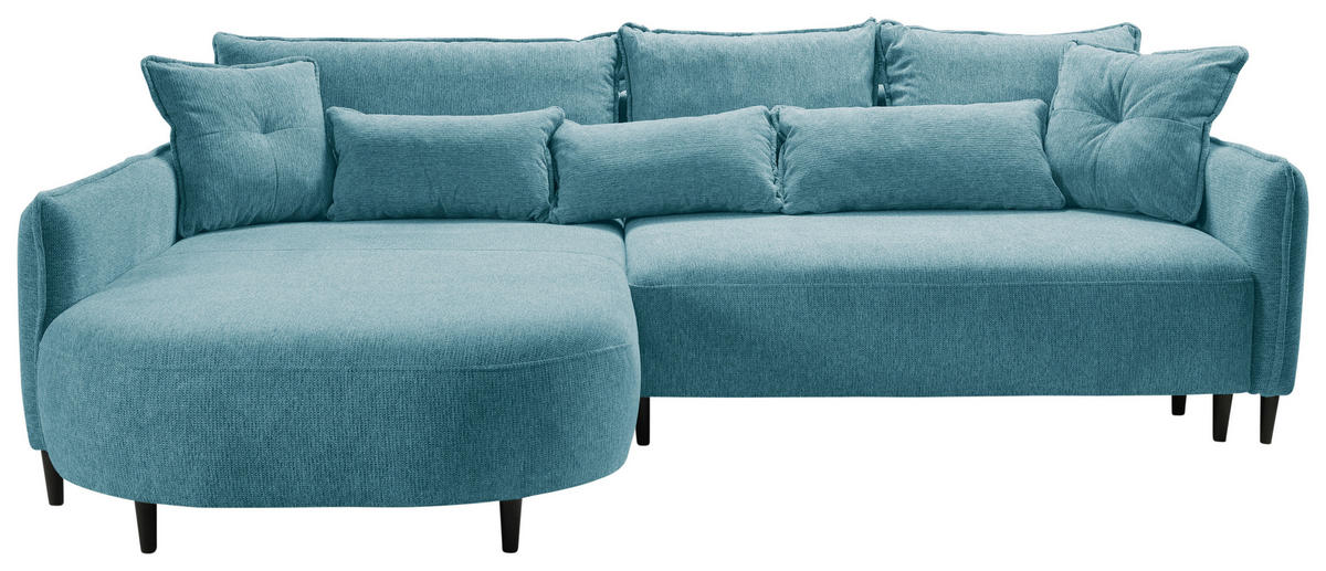 Ab auf Ihr blaues Ecksofa mit Chenille-Bezug und die ersehnte Me-Time genießen!