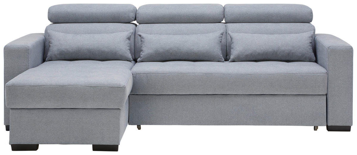 Ab auf Ihr blaugraues Ecksofa mit Webstoff-Bezug!