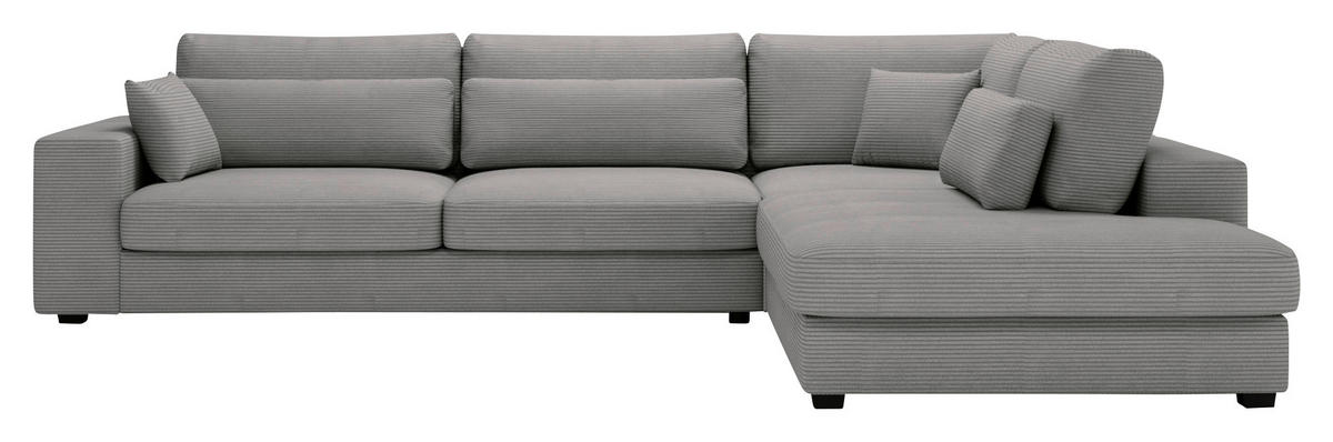 Eine Sonderportion Wohnglück schenkt Ihnen dieses graue Ecksofa mit Cord-Bezug. Greifen Sie zu!