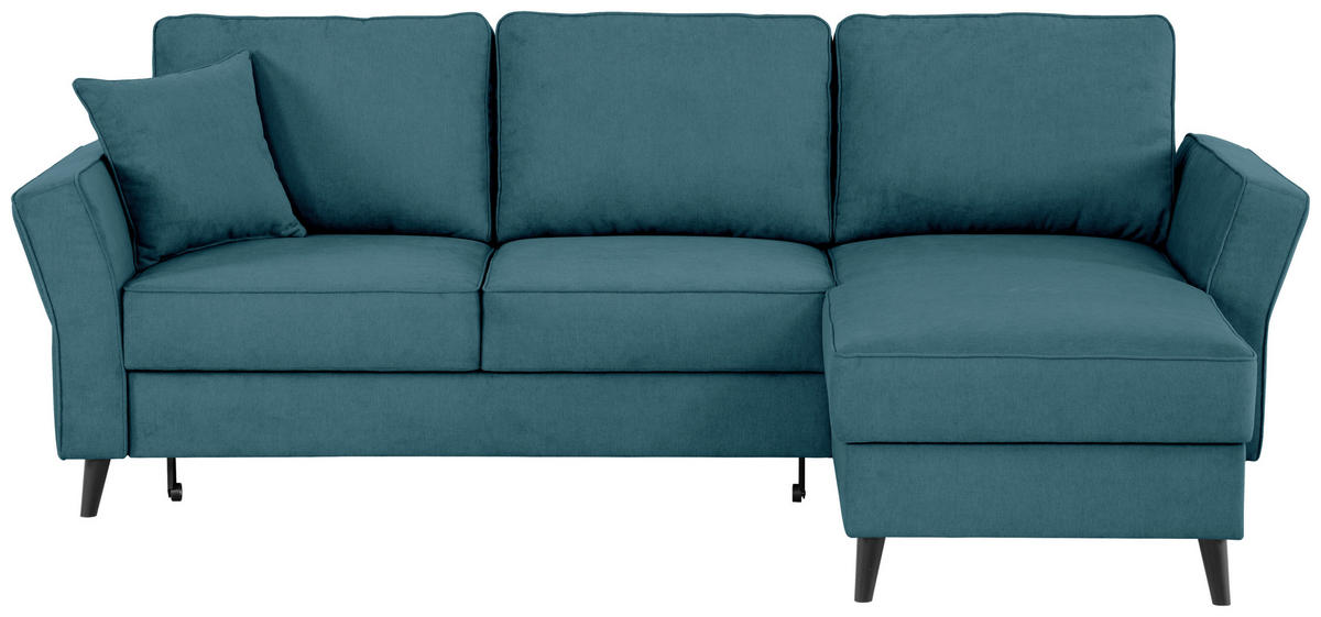 Sehenswerter Hingucker Die prägnante Farbgebung in Petrolfarben verhilft dem Polstermöbel zu einer geschmackvollen Optik. Hohe, konische Füße aus lackierter Buche in Schwarz schaffen Bodenfreiheit und vervollständigen stilgerecht das Design.