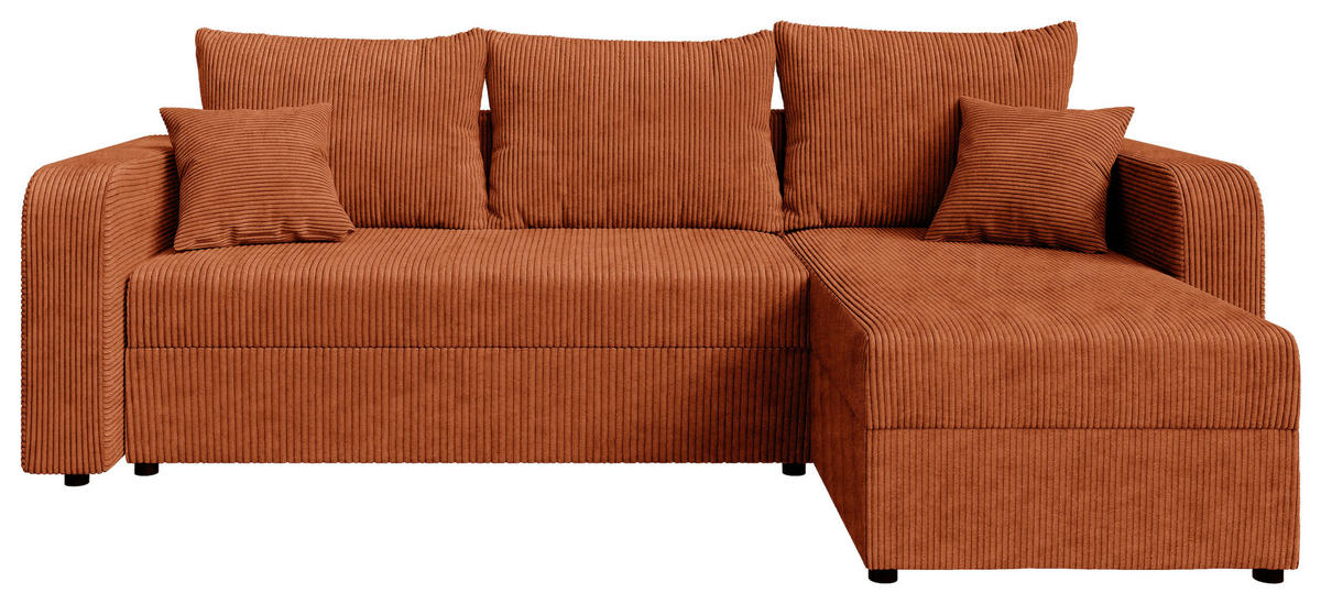 Eine Sonderportion Wohnglück schenkt Ihnen dieses rostrote Ecksofa mit Cord-Bezug. Greifen Sie zu!