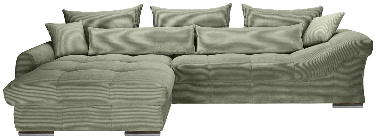 Als treue Begleitung für wonnige Time-outs daheim gesellt sich dieses salbeigrüne Ecksofa mit Cord-Bezug gerne zu Ihnen!
