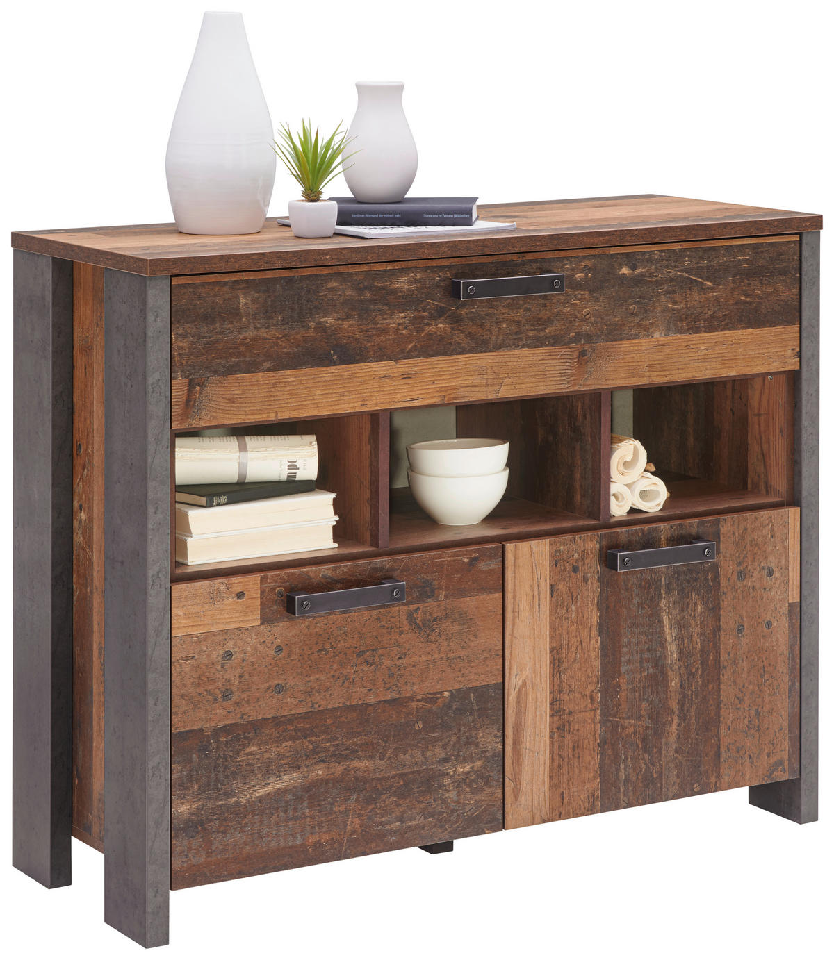 Diese Kommode in Braun und Grau wird zum chicen Blickfang in Ihrem Wohnraum. Das Möbel erinnert in den verschiedenen Brauntönen an den angesagten Vintage-Stil. Die gewollten Gebrauchsspuren deuten spannende Geschichten an, die Sie weitererzählen können. Farblich fügt sich die Betonoptik der Seiten toll ein. Die Bügelgriffe in Schwarz sind perfekt gewählt, um das stimmige Erscheinungsbild zu vervollkommnen.