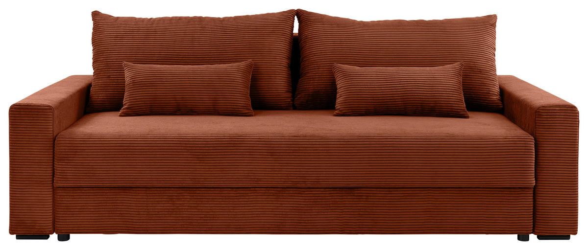 Rein in die Komfortzone: Dieses kupferfarbene Schlafsofa mit Cord-Bezug entführt Sie auf ein traumhaftes Terrain zum geruhsamen Durchatmen!