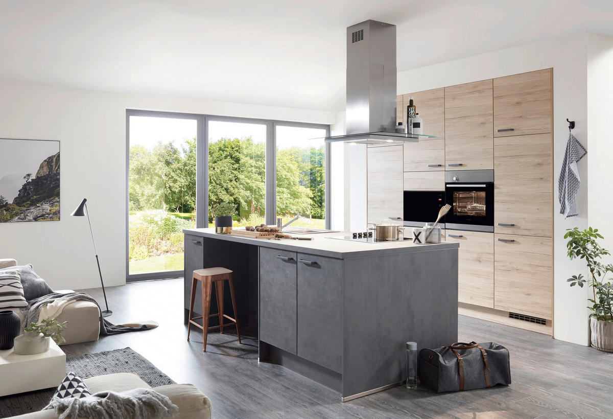 Einbauküche in Grau und Holzfarben mit Kochinsel: harmonische Kontraste