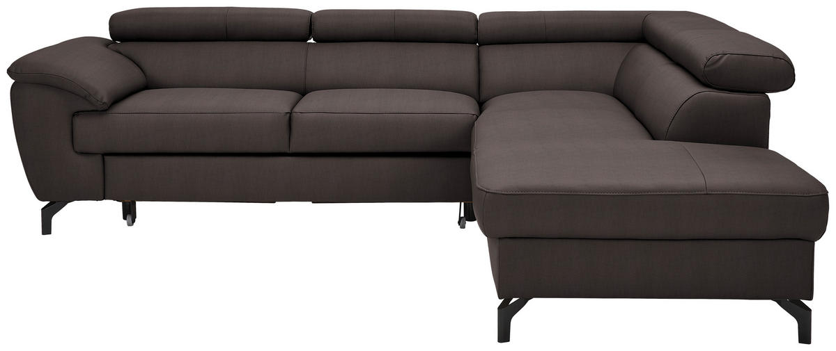 Dieses Design kann sich sehen lassen Ein harmonisches Ambiente, das unterschiedliche Einrichtungsstile geschmackvoll abrundet, kreiert das Polstermöbel mit seiner markanten Farbgebung in Dunkelbraun. Durch die hohen Winkelfüße aus mattem Stahl in Schwarz wird das Design adäquat komplettiert.