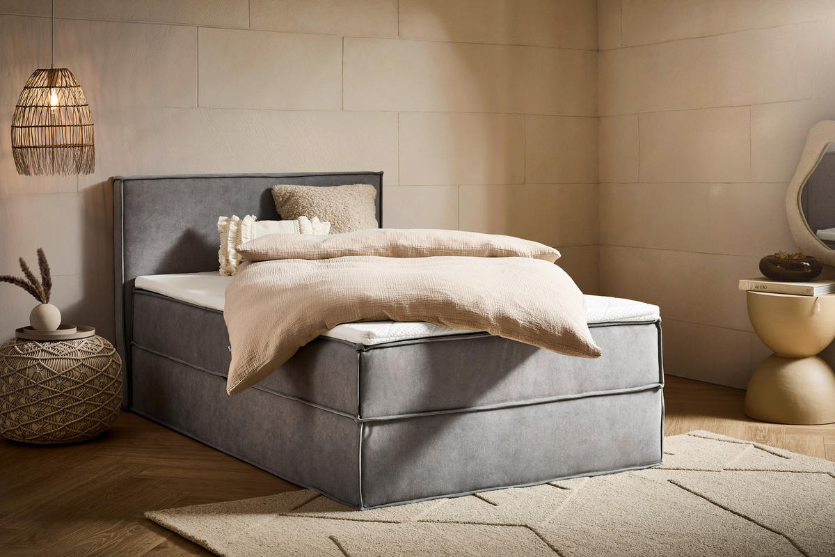 Durch das schlichte Kolorit in Hellgrau kreiert das Bett, hergestellt mit einem Synthetikfaser-Bezug (100 % Polyester), ein trendiges Wohlfühl-Interior im Schlafbereich. Der weiche