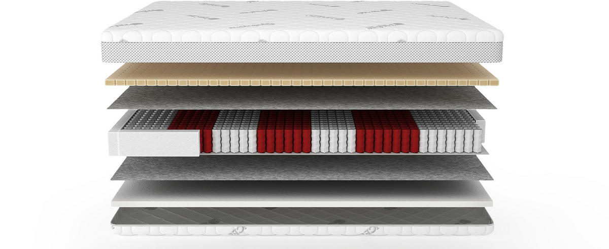 Latex-, Taschenfeder-, Kaltschaum- sowie Multi-Tonnentaschenfederkern kreiert perfekt abgestimmte Behaglichkeit, da es hygienische, langlebige und formbeständige Eigenschaften vereint. Genießen Sie die unterschiedlichen Matratzenhärtegrade: "fest" empfohlen für Personen ab ca. 80 kg und "sehr fest" ausgelegt für ein Körpergewicht ab ca. 100 kg. Dank der differenzierten