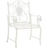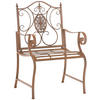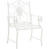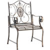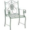 Der Stuhl besteht aus lackiertem Eisen. Dabei ist der Eisenstuhl pflegeleicht und kann mit einem feuchten Tuch und mildem Spülmittel gereinigt werden. Die Oberfläche des Gartenstuhls ist mit einer schönen Patina veredelt, passend zu den schönen Verzierungen. Vor direkten Witterungseinflüssen sollte der Gartensessel geschützt werden.