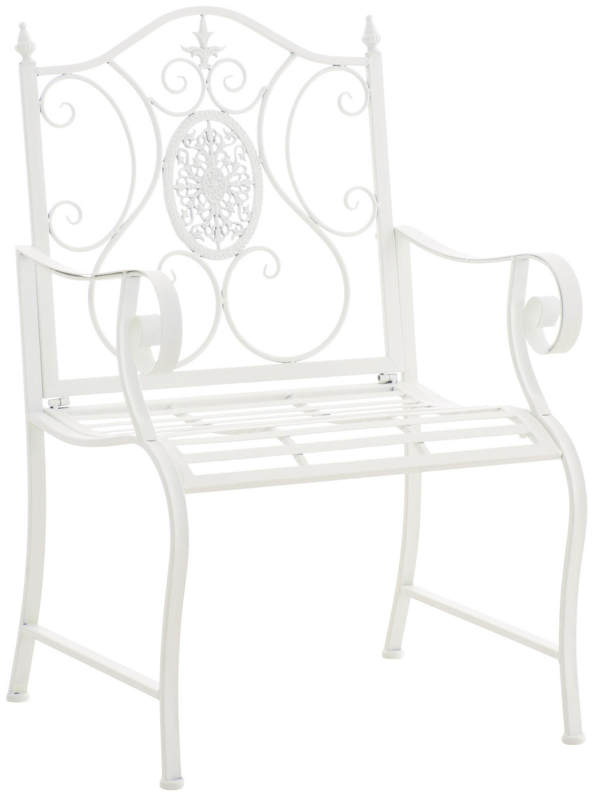 Der Stuhl besteht aus lackiertem Eisen. Dabei ist der Eisenstuhl pflegeleicht und kann mit einem feuchten Tuch und mildem Spülmittel gereinigt werden. Die Oberfläche des Gartenstuhls ist mit einer schönen Patina veredelt, passend zu den schönen Verzierungen. Vor direkten Witterungseinflüssen sollte der Gartensessel geschützt werden.