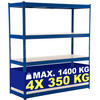 Zur Lagerung schwerer Gegenstände ist dieses Lagerregal bestens geeignet. In Kombination mit dem verzinkten Metallgestell kann jedes einzelne der vier Regal-Ebenen bis zu 350 Kilogramm tragen, sodass die insgesamte Traglast des Lagerregals 1,4 Tonnen beträgt. Die Höhe der Regalböden kann dabei dank des Stecksystems flexibel eingestellt werden.