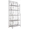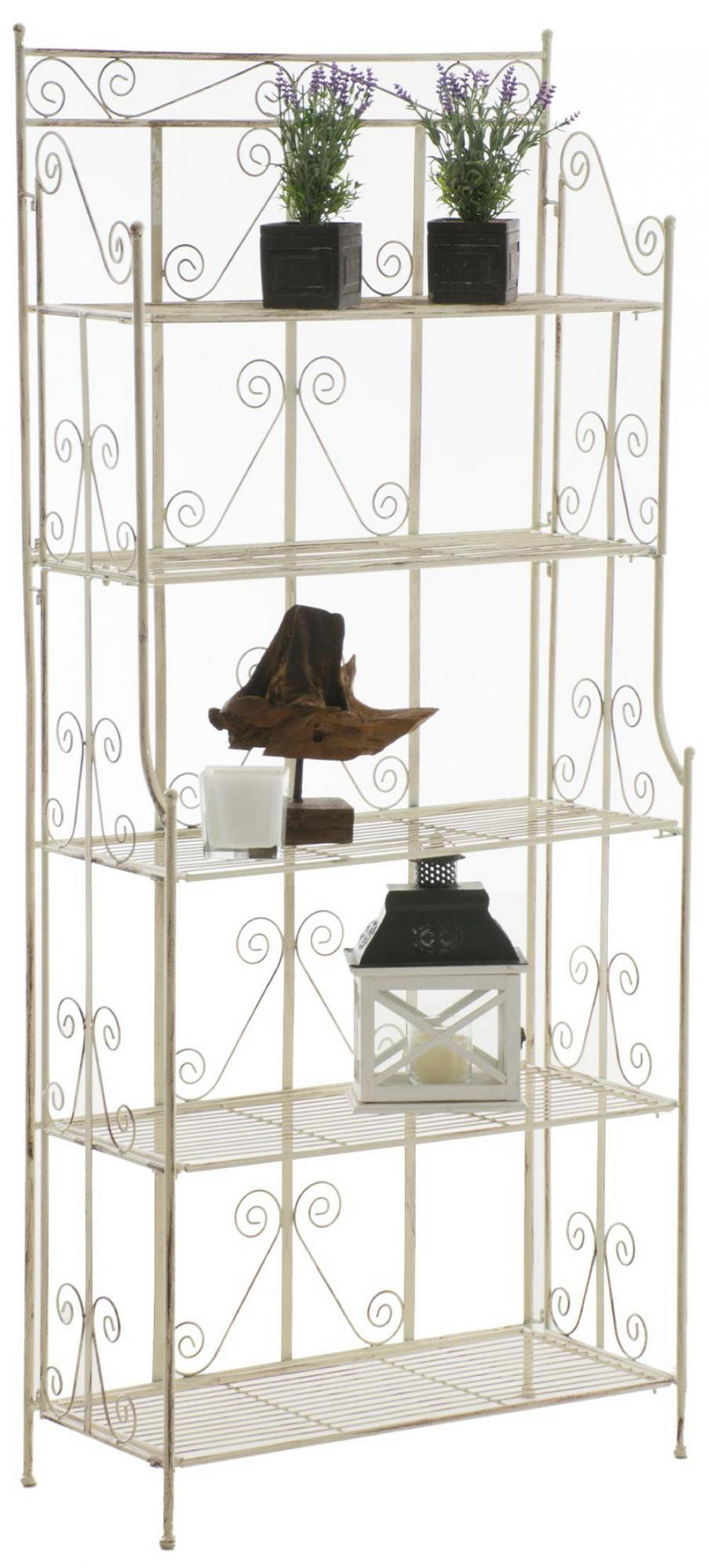 Das Standregal Ciara ist ein vielseitiges und dekoratives Regal im Landhausstil, das sowohl für den Innen- als auch Außenbereich geeignet ist. Mit seinen fünf klappbaren Regalböden bietet es ausreichend Platz für Pflanzen, Bücher und andere Dekorationsgegenstände. Die pulverbeschichtete Metallkonstruktion sorgt für Robustheit und Stabilität, wodurch es ideal für den Einsatz auf dem Balkon, im Garten, in der Terrasse sowie in Wohnzimmern und anderen Wohnräumen ist. Das platzsparende Design ermöglicht eine kompakte Lagerung, wenn das Regal nicht in Gebrauch ist. Die filigranen Verzierungen verleihen dem Regal eine attraktive Optik, die sich harmonisch in jeden Wohnstil einfügt. Das Standregal Ciara lässt sich schnell und einfach aufbauen und bietet durch die Klappfunktion der Regalböden zusätzliche Flexibilität.