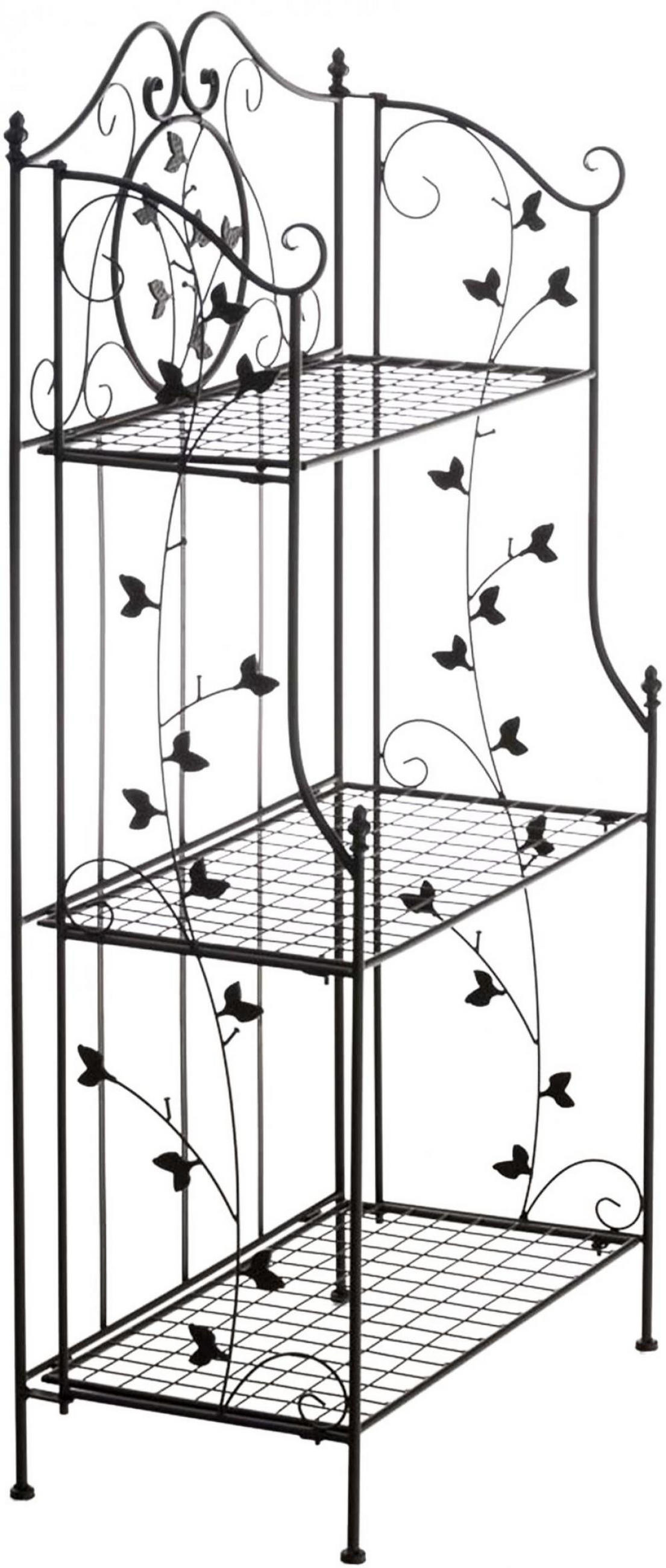 Das Standregal Reus ist ein dekoratives Pflanzen- und Allzweckregal im Landhausstil mit drei gestaffelten Gitterböden aus pulverbeschichtetem Metall. Die filigranen Blatt- und Rankenverzierungen am oberen Bogen und an den Seitenstreben geben dem Regal seinen romantischen Charakter und machen es zu einem stilvollen Blickfang im Garten, auf der Terrasse, im überdachten Außenbereich oder im Wohnraum.