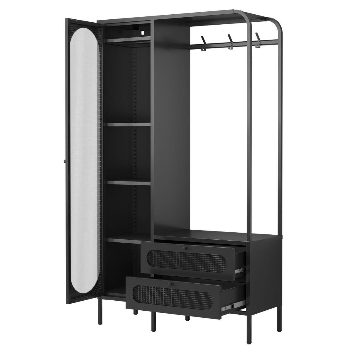 Die Mein-Regal Garderobe Paris ist der perfekte Mix aus Design und Alltagstauglichkeit. Mit ihrem klaren Look aus matt schwarzem Metall und der besonderen Riffelglastür bringt sie einen modernen, aber warmen Stil in dein Zuhause. Egal ob im Eingangsbereich, Schlafzimmer oder in der Ankleide – dieses Möbelstück passt sich mühelos an und sorgt sofort für eine aufgeräumte, elegante Atmosphäre. Zwei praktische Schubladen bieten Platz für alles, was du im Alltag schnell griffbereit haben möchtest – von Accessoires bis hin zu Papieren oder kleinen Dingen, die sonst gerne herumliegen. Hinter der Riffelglastür verbergen sich höhenverstellbare Regalböden, die du flexibel an deine Bedürfnisse anpassen kannst. Außerdem gibt es eine stabile Kleiderstange aus Metall und drei Haken, perfekt für Jacken, Taschen oder Hüte. Die verstellbaren Füße sorgen auch auf unebenen Böden für sicheren Stand, und die optionale Wandhalterung bietet zusätzliche Stabilität. Alles an dieser Garderobe ist auf Langlebigkeit und Stil ausgelegt – robust, modern und mit viel Liebe zum Detail gefertigt. Geliefert wird die Garderobe zerlegt zur Selbstmontage. Die beiliegende Anleitung ist klar und einfach gestaltet, sodass der Aufbau schnell gelingt. Schon nach kurzer Zeit steht dein neues Lieblingsmöbel – ein echter Hingucker, der Ordnung schafft und deinen Wohnraum aufwertet.