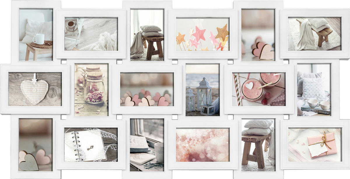 Dieser Bilderrahmen überzeugt durch seinen originellen Look. Anstatt sich für ein Bild entscheiden zu müssen, bringen Sie hier 18 Fotos unter. Das Wohnaccessoire setzt sich aus mehreren aneinander angebrachten Kunststoffrahmen zusammen - so entsteht ein kreatives Design. Durch die Gestaltung in klarem Weiß passt das Accessoire zu unterschiedlichsten Einrichtungsstilen. Familienfotos, Urlaubsschnappschüsse sowie Bilder von früher - hier finden all Ihre Erinnerungen einen angemessenen Platz!
