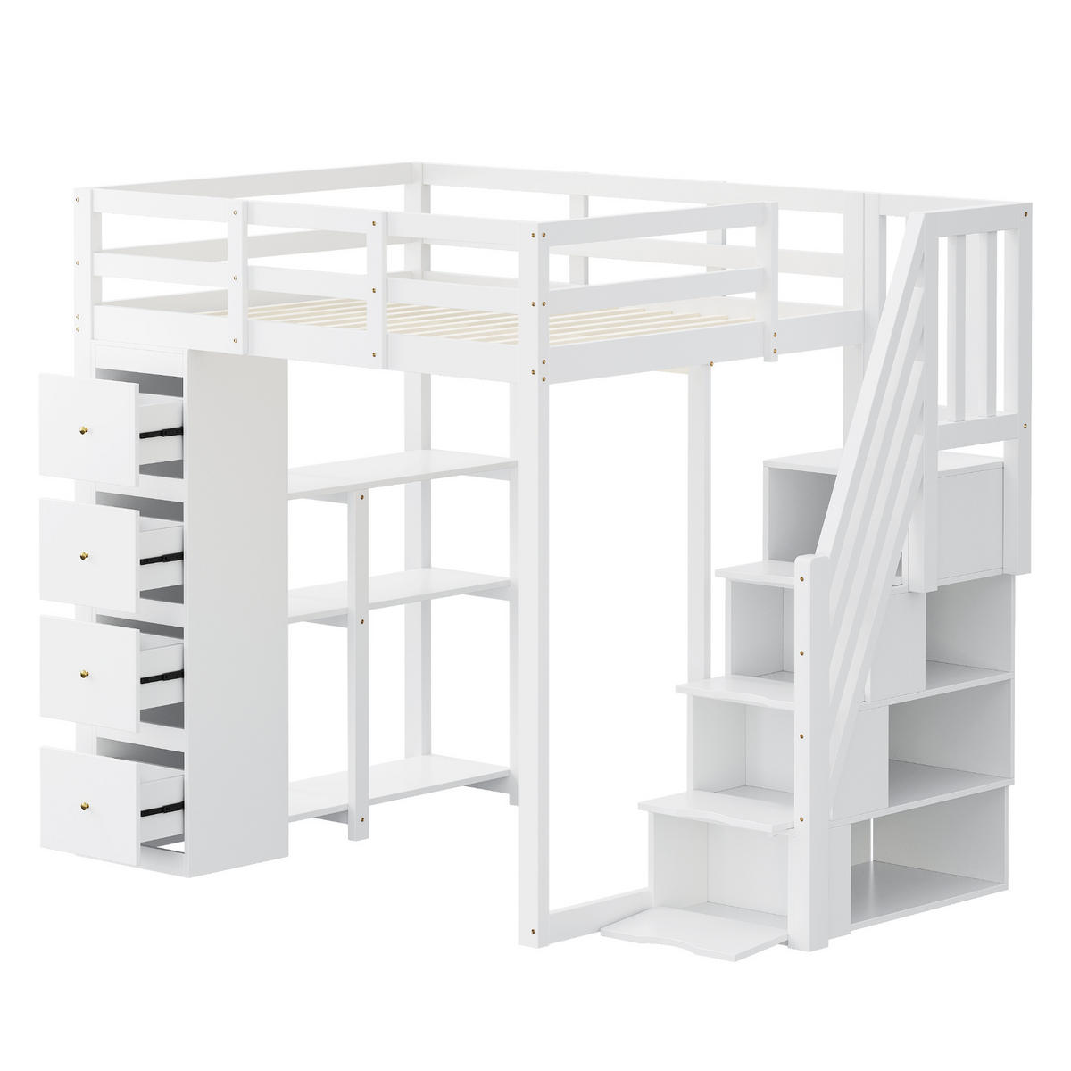 Dieses Hochbett in Weiß aus massivem Kiefernholz bietet einen Schlafbereich (140x200 cm), 4 große Schubladen, ein 3-stufiges Regal, eine Sicherheits-Kletterleiter mit integrierten Aufbewahrungsschubladen sowie 15 Lattenroste. Perfekt für Kinder- und Jugendzimmer, um Schlaf-, Stauraum und Spielbereich zu vereinen. Inklusive Lattenrost – Matratze separat erhältlich (empfohlene Höhe 8-10 cm).