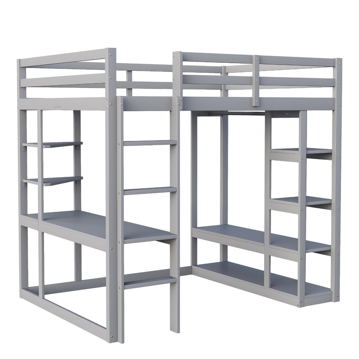Dieses Hochbett in Grau aus massivem Kiefernholz bietet einen Schlafbereich (140x200 cm), einen integrierten Schreibtisch mit schrägen Regalen, eine einfache Garderobe mit Kleiderstangen und Ablageflächen unter dem Bett, eine Leiter sowie 15 Lattenroste. Perfekt für Kinder- und Jugendzimmer, um Schlaf-, Arbeits- und Stauraum zu vereinen. Inklusive Lattenrost – Matratze separat erhältlich (empfohlene Höhe 8-12 cm).