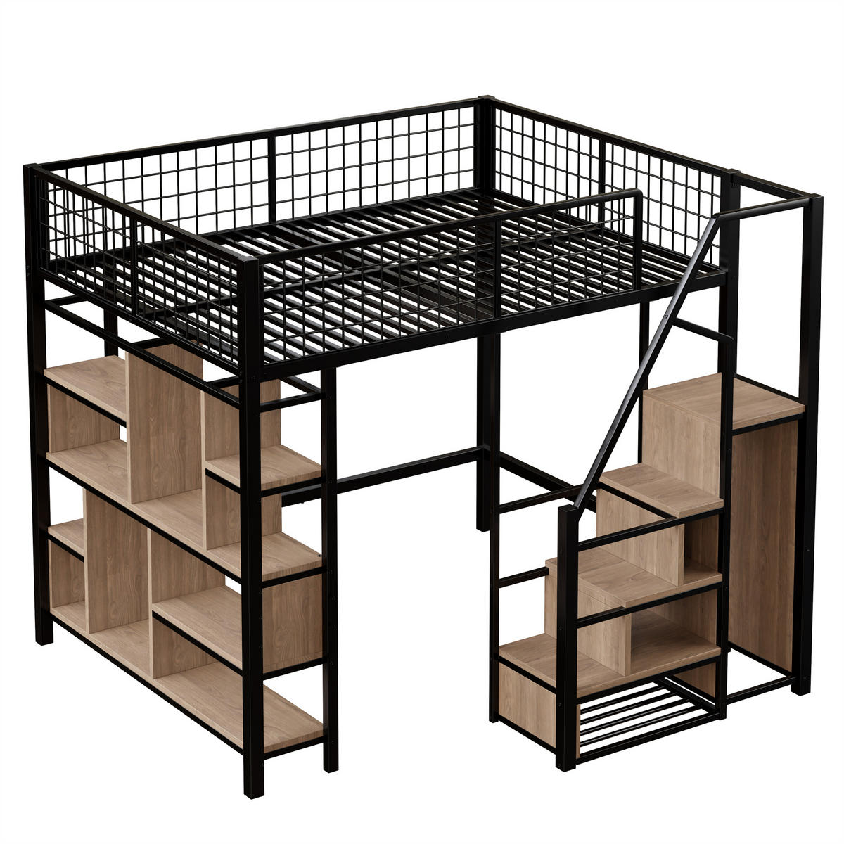 Dieses multifunktionale Hochbett in Schwarz aus stabilem Metall bietet einen Schlafbereich (140x200 cm), eine Stauraumtreppe mit integrierten Fächern, geräumige Ablageflächen unter dem Bett sowie 20 Lattenroste. Perfekt für kleine Wohnungen, Erwachsenen- und Kinderzimmer, um Schlaf-, Stauraum und Arbeitsbereich zu vereinen. Inklusive Lattenrost – Matratze separat erhältlich (empfohlene Höhe 8-10 cm).