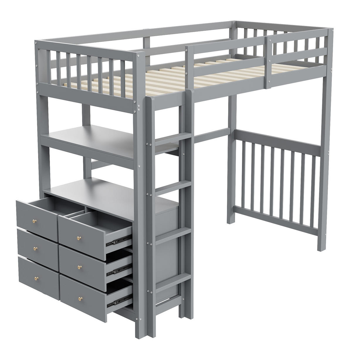 ComfortXL HOCHBETT 90/200 cm DE-01304, in Grau, mit Sicherheitsleiter, Schubladen und Regalen