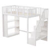Dieses Hochbett in Weiß aus massivem Kiefernholz bietet einen Schlafbereich (90x200 cm), eine Stauraumtreppe mit Sicherheitsleiter, drei große Staufächer an der linken Seite, ein Sicherheitsgeländer sowie 15 Lattenroste. Perfekt für Kinder- und Jugendzimmer, um Schlafkomfort, Sicherheit und Stauraum zu vereinen. Inklusive Lattenrost – Matratze separat erhältlich (empfohlene Höhe 8-12 cm).
