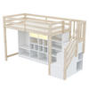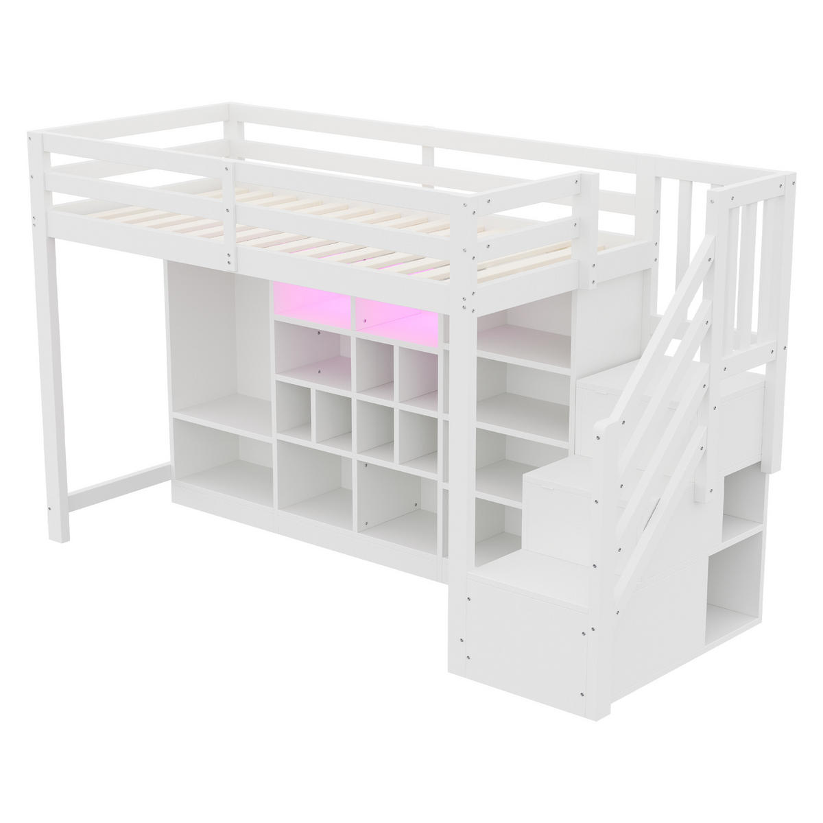 Dieses weiße Hochbett bietet integrierte Stauraumschränke mit mehreren unterteilten Regalen, einen einfachen Kleiderschrank mit Kleiderstange und eine Seitenleiter mit verstecktem Stauraum. Die LED-Lichtleiste unter dem Bettrahmen schafft eine warme und gemütliche Atmosphäre für Kinder- und Jugendzimmer.