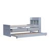 Dieses Kinderbett in Grau aus massivem Kiefernholz bietet ein ausziehbares Hauptbett, zwei integrierte Schubladen, einen Nachttisch mit Ablagefach und USB-Buchse sowie einen stabilen Lattenrost mit 30 Latten. Perfekt für Jugend- und Gästebetten, um Schlaf- und Stauraum zu vereinen. Inklusive Lattenrost – Matratzen separat erhältlich.