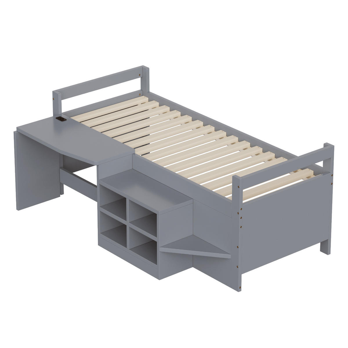 Dieses Kinderbett in Grau aus massivem Kiefernholz bietet mehrere eingebaute Stauschränke, einen Schreibtisch mit multifunktionalen Steckdosen (2 USB + 1 EU-Rundsteckdose), eine Stufe an der Vorderseite für leichteren Zugang sowie 15 Lattenroste. Perfekt für Kinderzimmer, um Schlafkomfort, Lernbereich und Stauraum zu vereinen. Inklusive Lattenrost – Matratze separat erhältlich (empfohlene Höhe 6-10 cm).