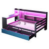 Dieses Kinderbett in Schwarz und Rot vereint Schlafbereich, Schreibtisch, Bücherregal, Regale und Schubladen in einem multifunktionalen Holzdesign. Die LED-Lichtleisten entlang der Bettkante und die Steckdosen mit USB-Ladeanschlüssen am Fußende schaffen einen idealen Arbeits- und Schlafplatz.